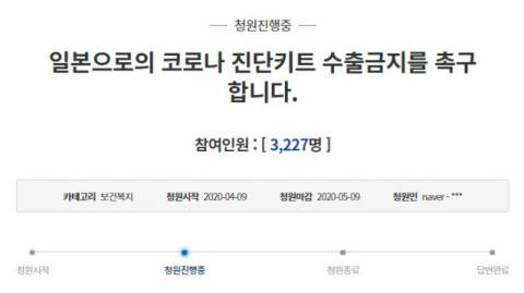 該当請願はこの日午前11時50分基準3,200人余りが参加し来る5月9日締め切る。これと共にこの日、大統領府国民請願ホームページには「日本政府公開的謝罪前のキット日本輸出を禁止してください」「コロナ19関連診断キット、日本輸出反対」などの請願が相次いで掲載された。